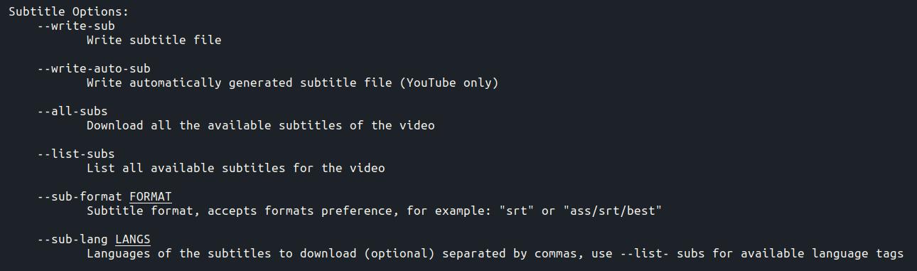 Note: You can check the available languages and formats with youtube-dl --list-subs YOUR_URI. --sub-lang en specifies English langugage, and skip-download is the only part, that is an opt for subtitles only. In this way video content will not be downloaded.